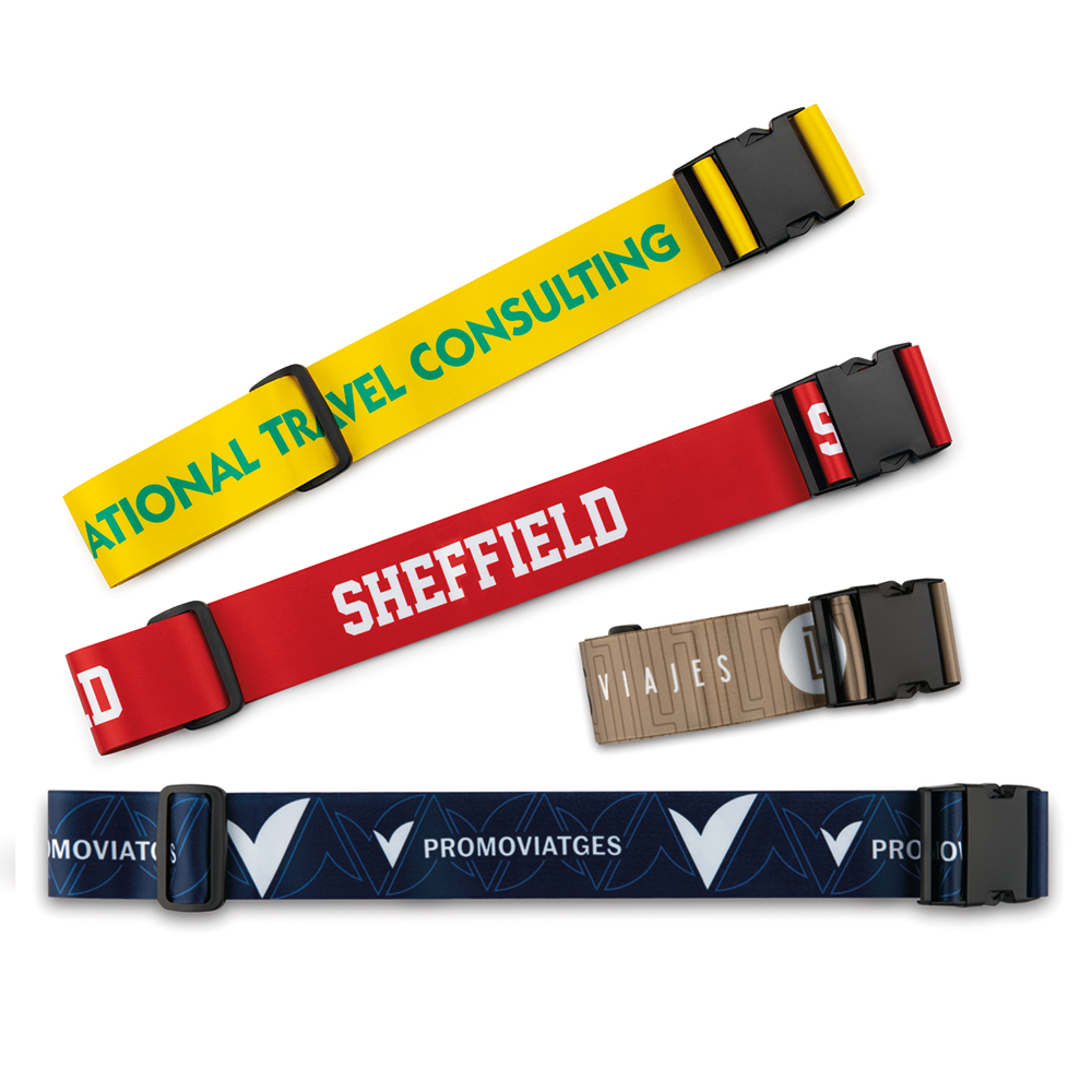 Cinta para mala personalizada por sublimação em ambas as faces. Fabricada em poliéster e com fecho de fivela de plástico. Medida de 90 cm x 2 (ajustável).