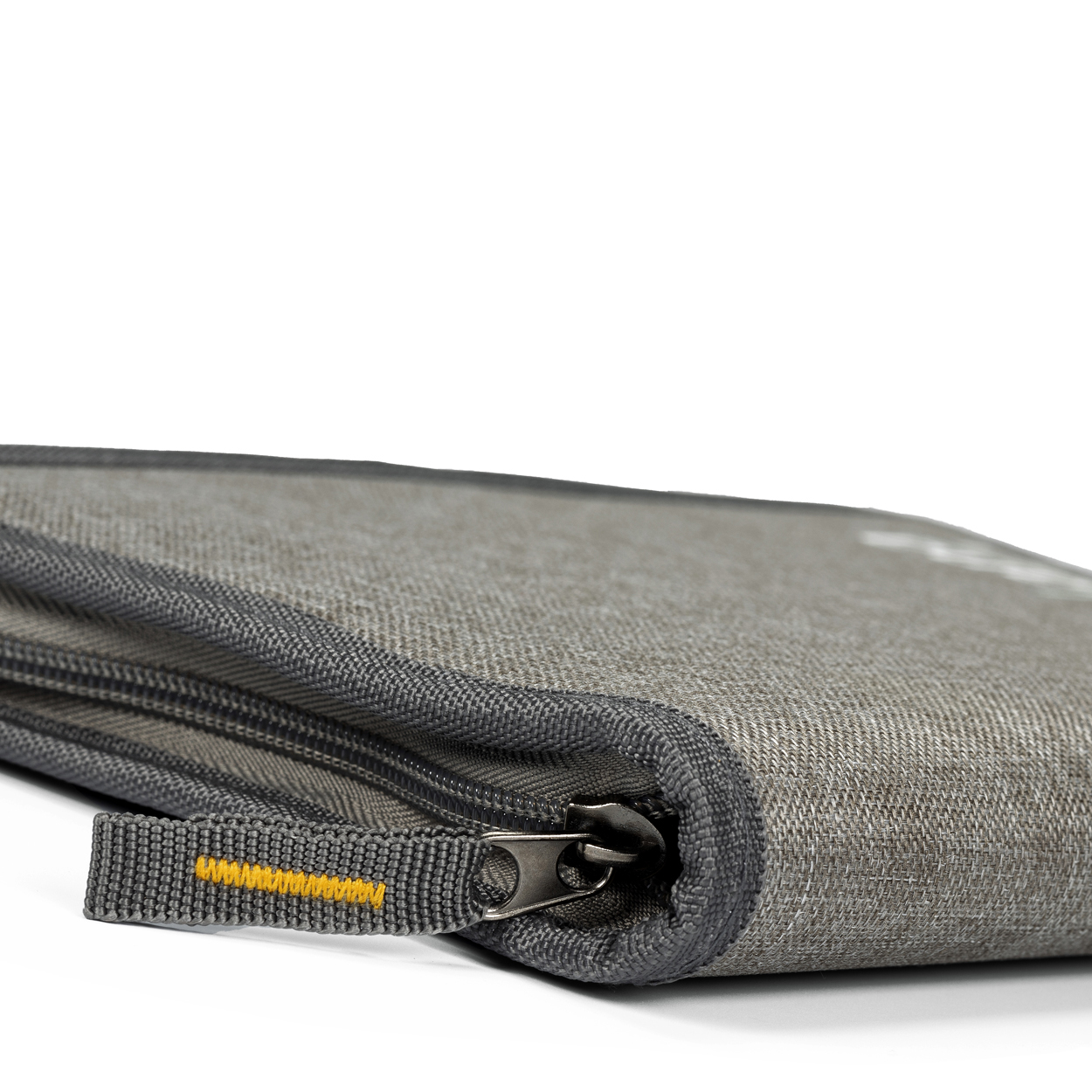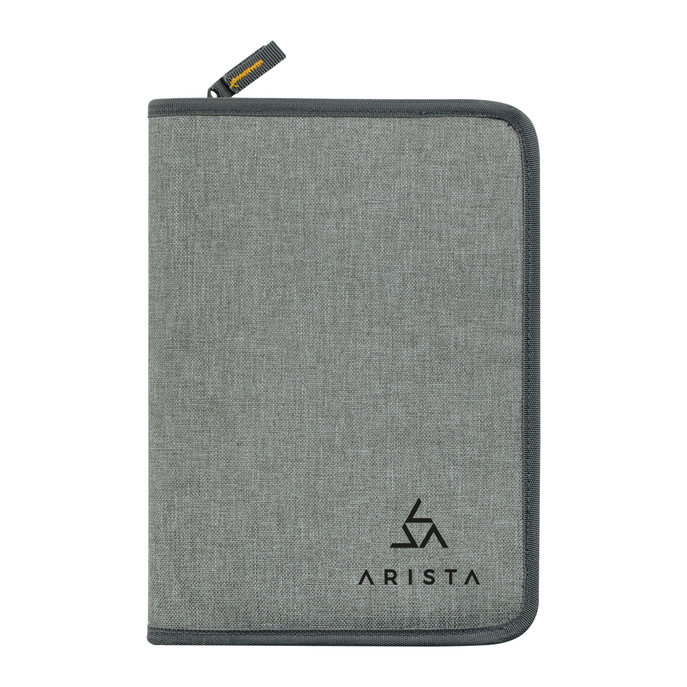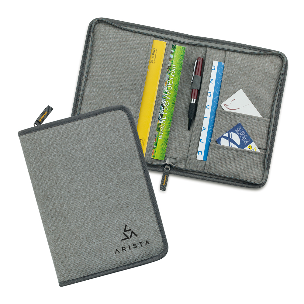 Carteira de documentação fabricada em nylon cinzento, com fecho zipper e vários compartimentos em ambos os lados para a documentação. A personalização é feita através do logotipo em quadricromia.