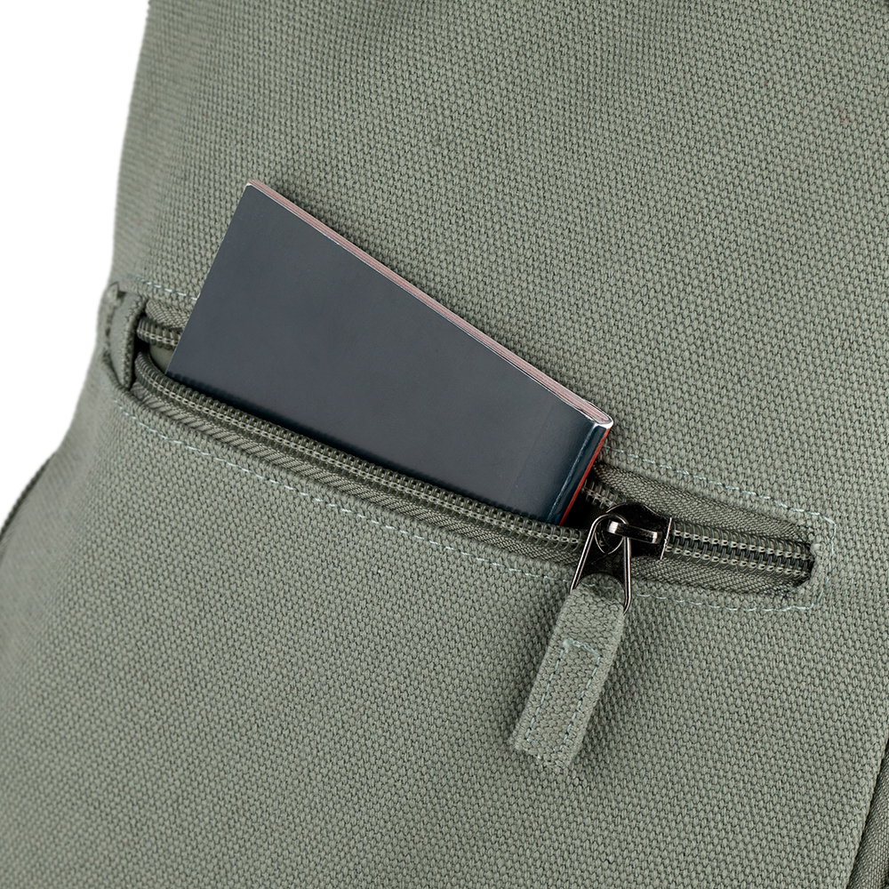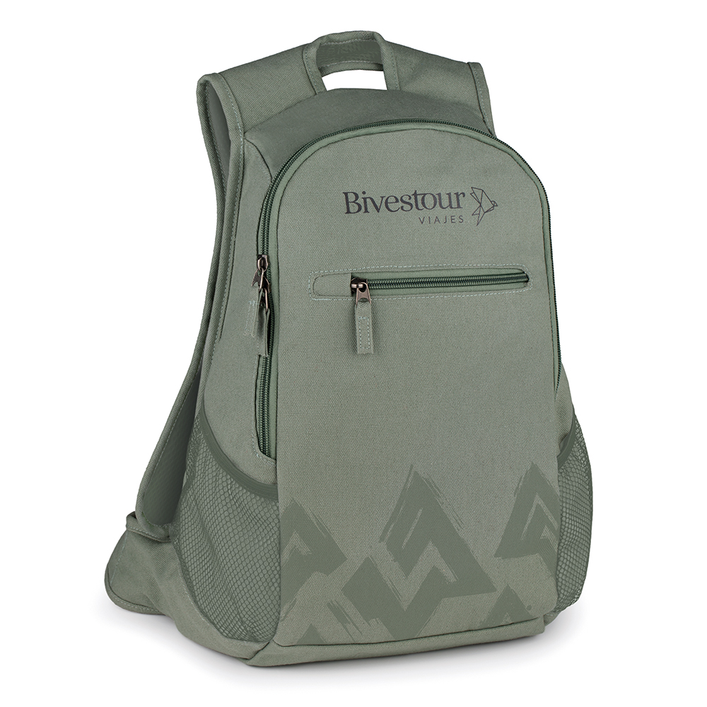Mochila verde em algodão 100% reciclado. Alças acolchoadas e dois bolsos laterais em rede. Bolso frontal com fecho de correr e detalhe estampado para um toque moderno e original. Personalização a cores diretamente no material.