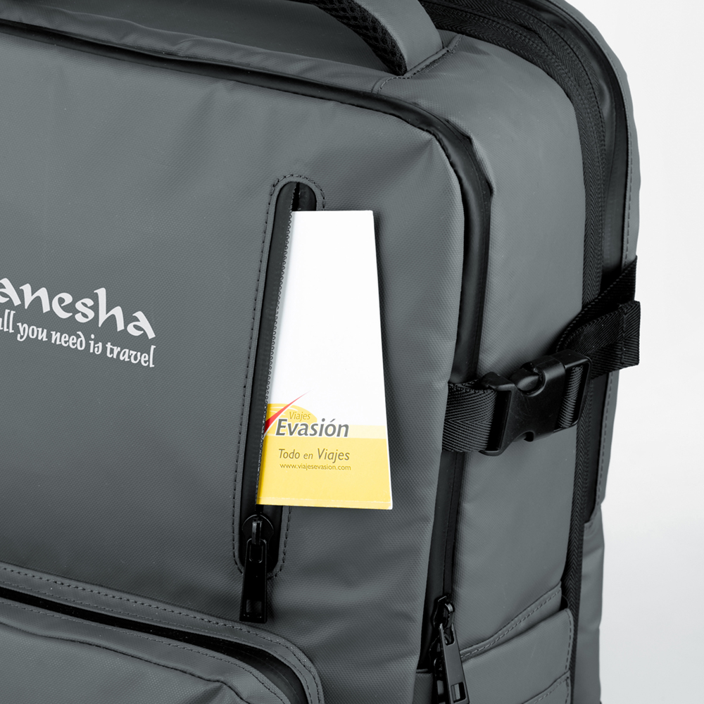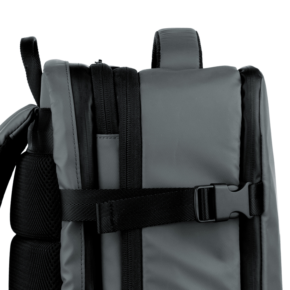Mochila-mala cinzenta com múltiplos compartimentos acolchoados. Ideal como bagagem de mão. Alça e costas acolchoadas para maior conforto, com alças de ombro ajustáveis. Graças à tira traseira, pode ser apoiada no telescópico da mala. Ideal para viajar. Dimensões perfeitas para caber debaixo do assento dianteiro do avião.