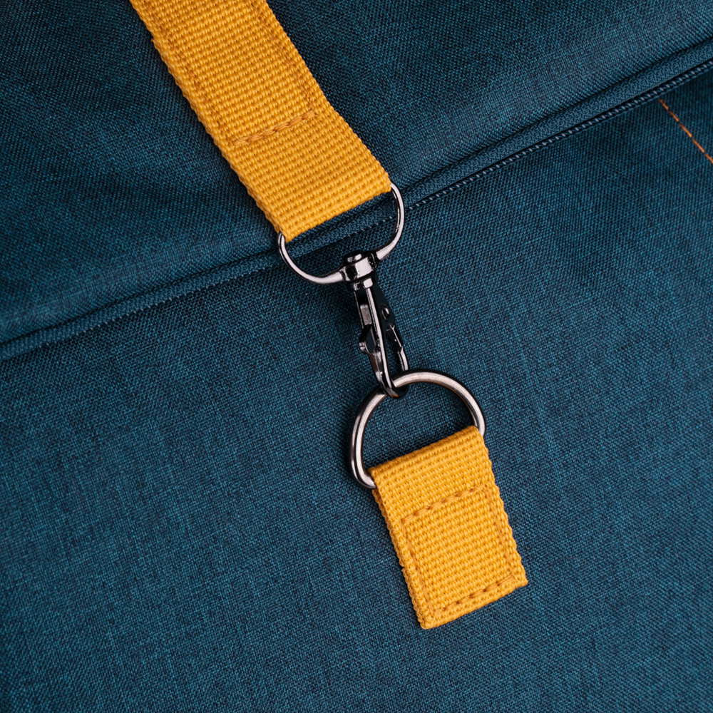 Mochila de design atrativo, fabricada em material 100% reciclado. Fecho superior com fecho de correr e mosquetão, proporcionando fácil acesso e maior segurança. Dois bolsos laterais, um deles com rede. Material com acabamento catiónico, conferindo-lhe um aspeto de ganga. Personalização através de impressão digital a cores.